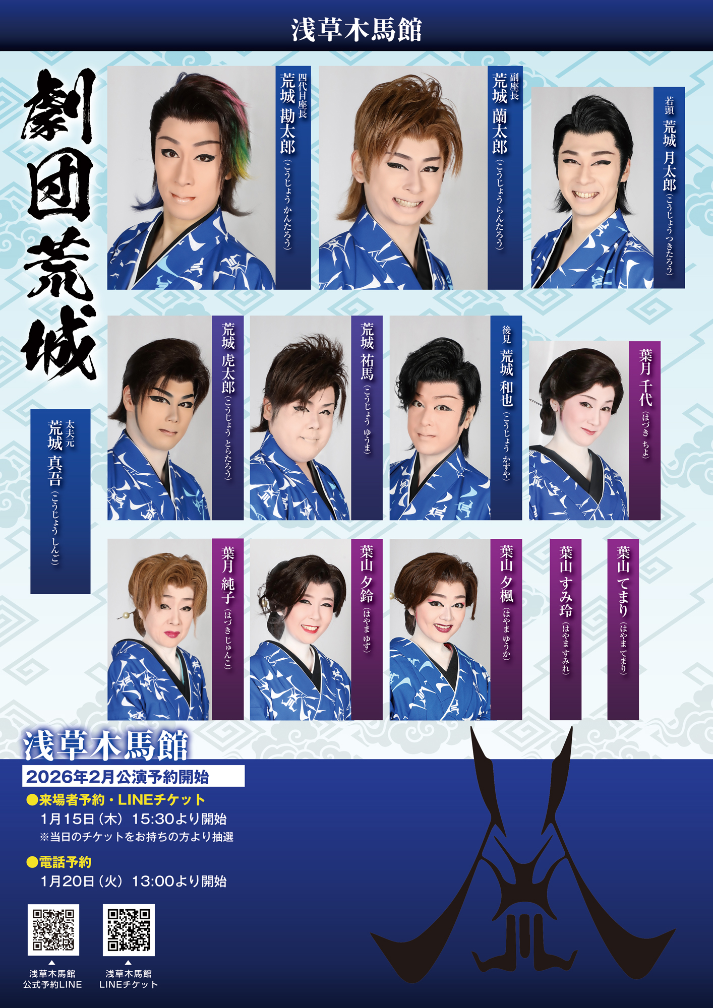 浅草木馬館 2月公演 劇団荒城 【公演日程】2026.2月1日(日)~2026.2月26日(木) 【公演時間】(昼の部)12:00~15:00(夜の部)17:30~20:30 【金  額】大人指定席2400円 子供指定席1400円